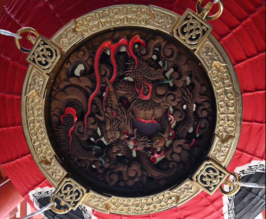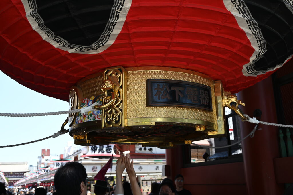 Pierwsze co mijamy wchodząc na teren kompleksu, to brama Kaminari-mon (brama gromu), której w jej wnękach strzegą Fujin i Rajin (bogowie wiatru i gromu – jeśli graliście w Final Fantasy VIII to zapewne kojarzycie te imiona). W środku bramy wisi gigantyczny lampion Chochin, wykonany z papieru i bambusa – ma prawie 5m wysokości, ponad 3 szerokości i waży niemal 700kg! Lampion ufundował Kōnosuke Matsushita, założyciel Panasonic.