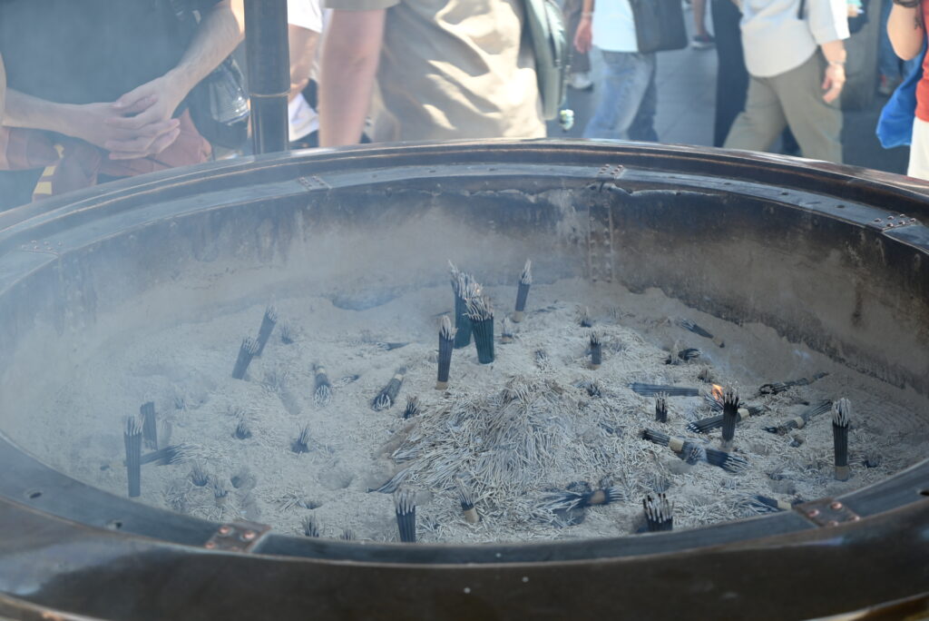 Mijając drugą bramę warto obejrzeć się za siebie, można wtedy zobaczyć gigantyczny słomiany klapek. Dalej na północ znajduje się plac na którym stoi ogromna kadzielnica (jokoro), w której kadzidła pali się po kilkadziesiąt na raz. Po lewej można podziwiać przepiękną pięciopiętrową pagodę i kilka budynków świątynnych (nie da się do nich wejść, więc zapewne wykorzystywane są przez mnichów).
