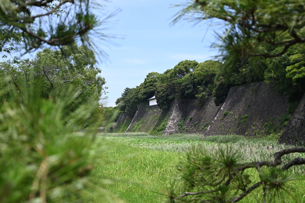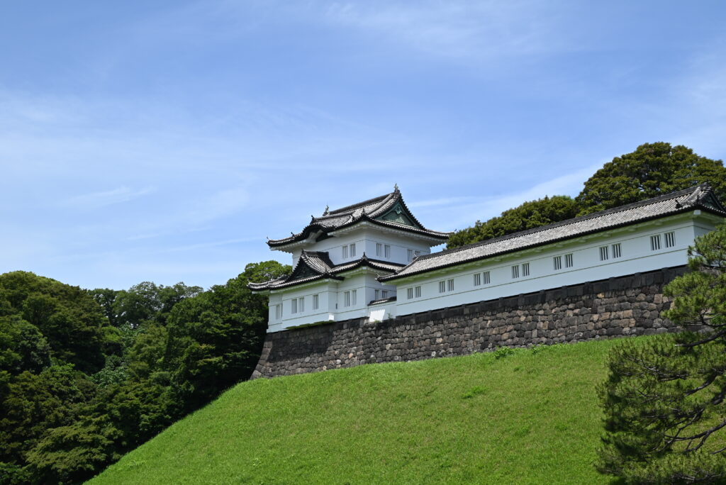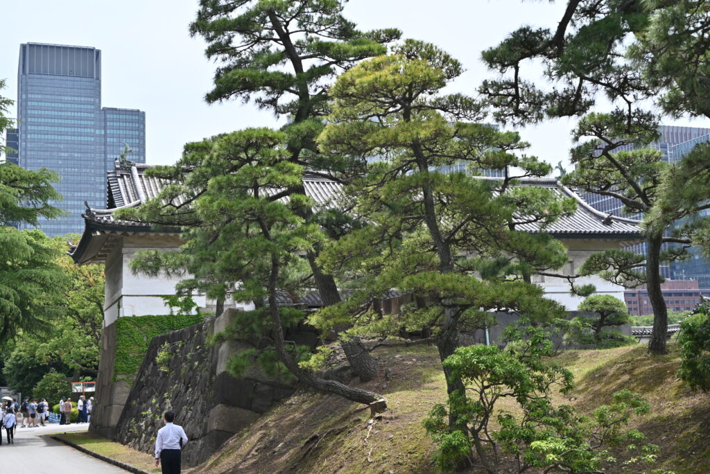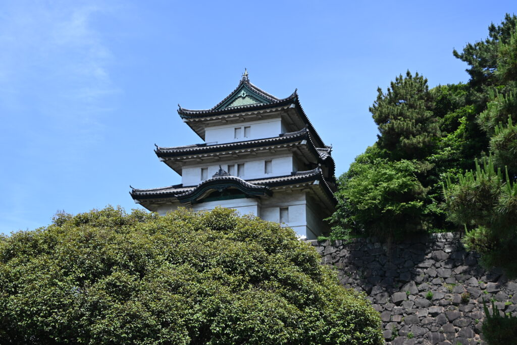 Następnie wchodzi się przez bramę Nishinomaru na most Nijubashi (który na zdjęciach lepiej wychodzi z ogólnodostępnej części ogrodów zewnętrznych) – i wycieczka zawraca, obchodząc budynek agencji od tyłu, gdzie mamy widok na fosę i mur dawnego pałacu Edo, zamieszkiwany kiedyś przez dynastię Tokugawa. Zamek spłonął niedługo po zmierzchu ery szogunów, a gdy epoka Meiji nastała, resztę systematycznie rozebrano, gdy Edo zmieniło nazwę na Tokio i trwała modernizacja stolicy. Pozostały jedynie trzy obronne wieże. Mijamy jeszcze prywatną stację benzynową cesarza i jego pracowników i na tym kończy się wycieczka. Sam władca mieszka znacznie głębiej w lesie i nie widzimy nawet centymetra jego faktycznej posiadłości, tak samo jak on nie widzi tych kilkunastu limitowanych grup wycieczkowych chodzących codziennie po jego posiadłości.