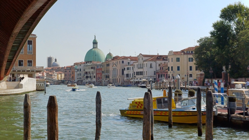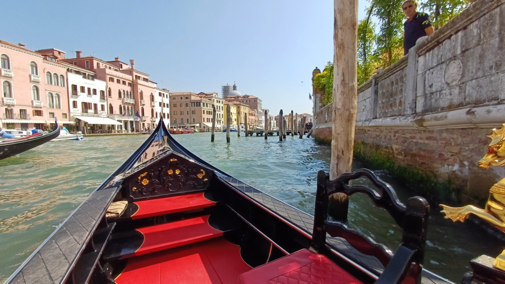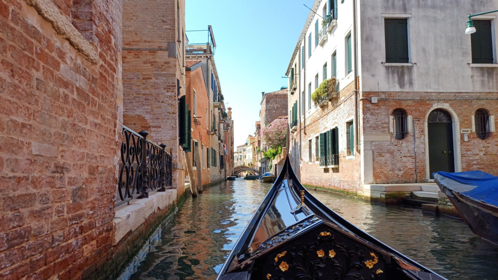 Idąc nieco na oślep przez Ponte degli Scalzi, dotarliśmy do Ponte Ruga Bella gdzie wsiedliśmy w gondolę. Podróż trwała ponad pół godziny i prowadziła bocznymi kanałami, często w cieniu (dzięki czemu był przyjemny chłód) i z dala od zgiełku, pozwalając cieszyć się szumem wody.